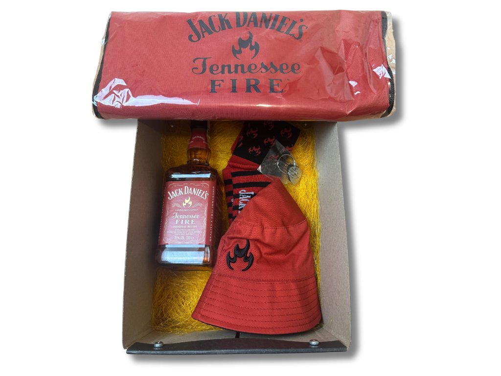 Základem boxu je láhev Jack Daniel’s Fire 0,7 l – jemná Tennessee whiskey s intenzivní skořicovou chutí, která skvěle chutná samotná, na ledu i v jednoduchých mixech. Nechybí ani stylové ponožky, klobouk a praktický vak Jack Daniel’s Fire, díky nimž může obdarovaný reprezentovat svou oblíbenou značku i mimo bar.